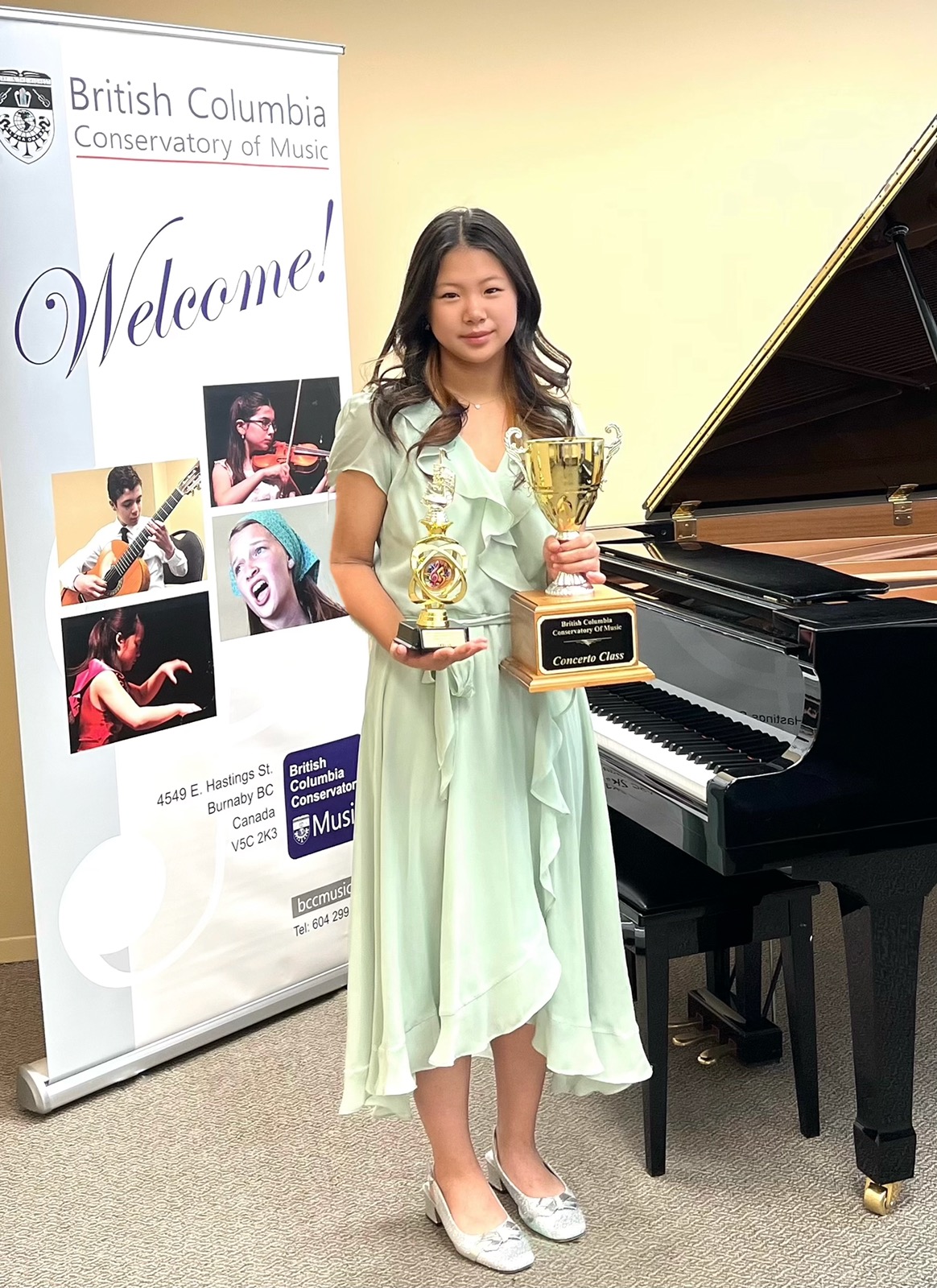 Congratulations to Ariel Liu, First Place Trophy and Scholarship Winner of the British Columbia Conservatory of Music Concerto Class. Ariel received a mark of 99 (highest mark in the festival) performing Mendelsohn’s Piano Concerto No.1 in g minor (2nd and 3rd movements).